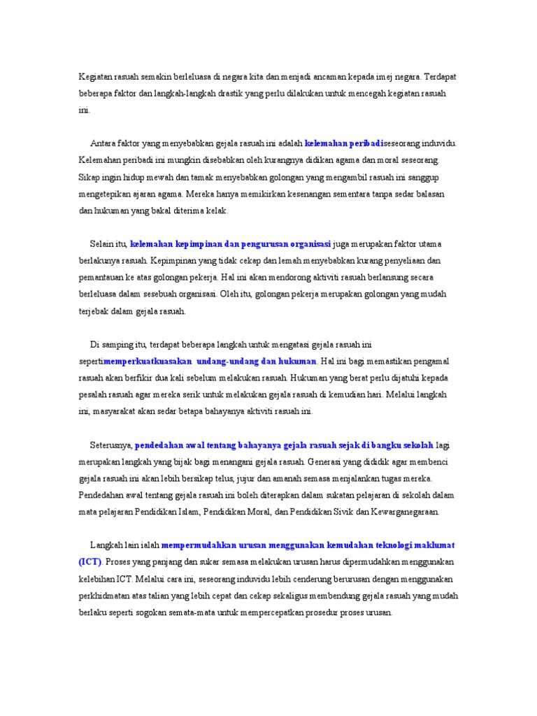 Didikan agama dan moral merupakan pedoman dan panduan kita semasa menempuh belantara kehidupan. Gejala rasuah merujuk kepada perbuatan menyogok seseorang dengan wang atau barangan agar orang yang disogok dapat menggunakan kuasa atau kemampuannya untuk menyelesaikan sesuatu tugas secara tidak amanah. Mana karangan untuk bahagian Kesan.